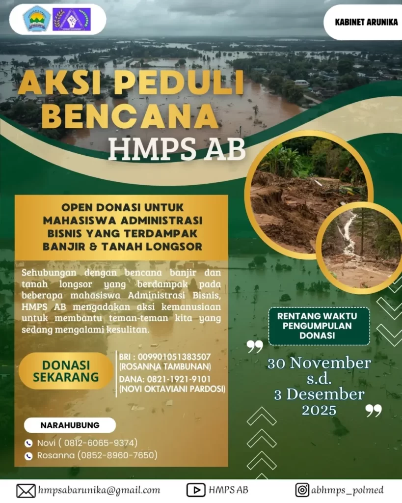PEDULI BENCANA SUMATERA UTARA[email protected]2026-02-20T05:07:09+00:00 PEDULI BENCANA SUMATERA UTARATransparansi Donasi Transparansi Donasi Link unduh transparansi pengumpulan dan penyaluran donasi banjir dan longsor Sumatera Utara bagi mahasiswa-mahasiswi Program Studi D3 Administrasi Bisnis yang terdampak bencana. DOKUMENTASI DONASI BENCANA